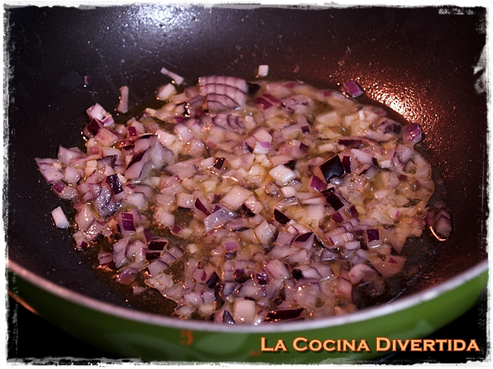 5. En la misma sartén, añadimos un par de cucharadas de aceite de oliva y rehogamos la cebolla y el ajo a fuego medio durante 5-7 minutos, sin que se nos dore demasiado.