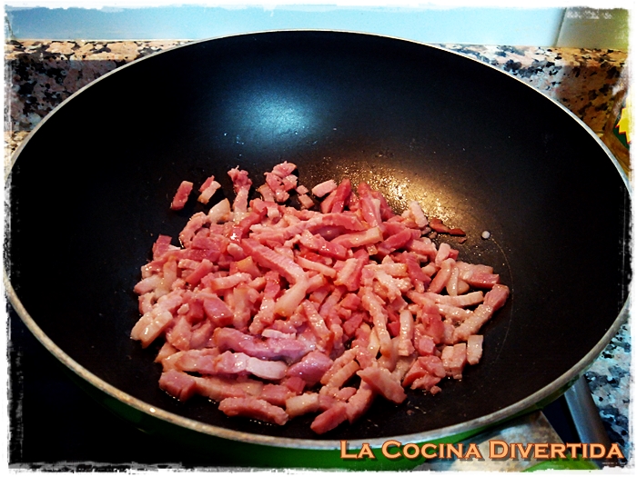 1. En una sartén, sin aceite, vertemos las tiras de bacon y dejamos que se hagan a fuego medio fuerte durante 5-7 minutos.