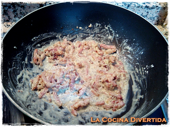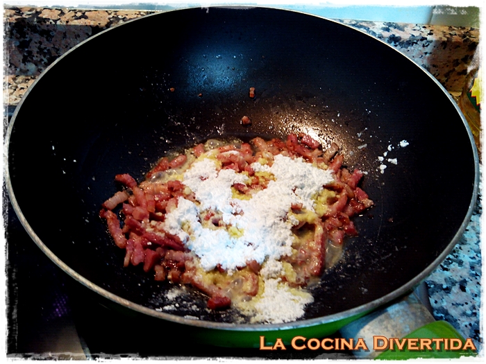 3. Cuando el bacon está hecho y empieza a dorarse añadimos la maicena y removemos bien para que se cocine con la grasa que ha soltado el bacon.