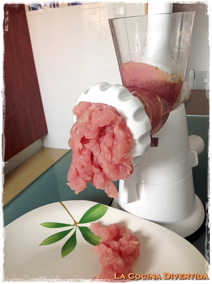 - Primeramente vamos a picar la carne de pavo. He utilizado solomillo de pavo, que en muchos supermercados lo venden así envasado. Para picar la carne he usado una picadora manual que compré hace poco y que pienso usar más de una vez, pero si no tenéis no pasa nada, a cuchillo os llevará más tiempo pero queda perfecto, primero en tiras finas y luego en daditos.