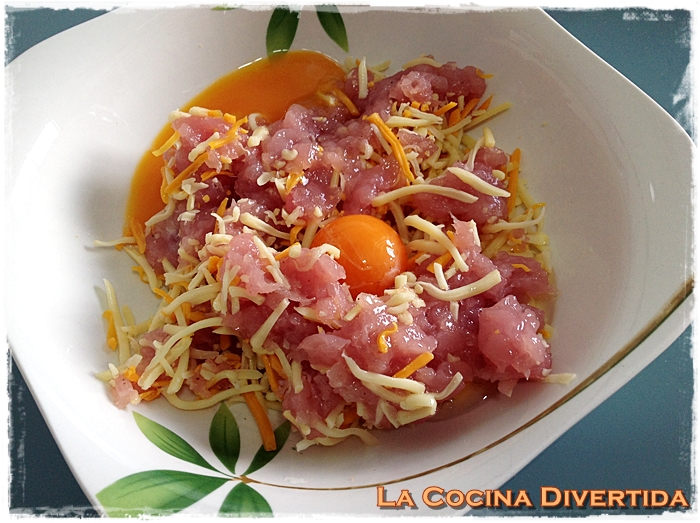 - Una vez picada la carne salpimentamos al gusto y añadimos las yemas de huevo y el queso rallado, en este caso una variedad cuatro quesos que le da un sabor muy rico.
