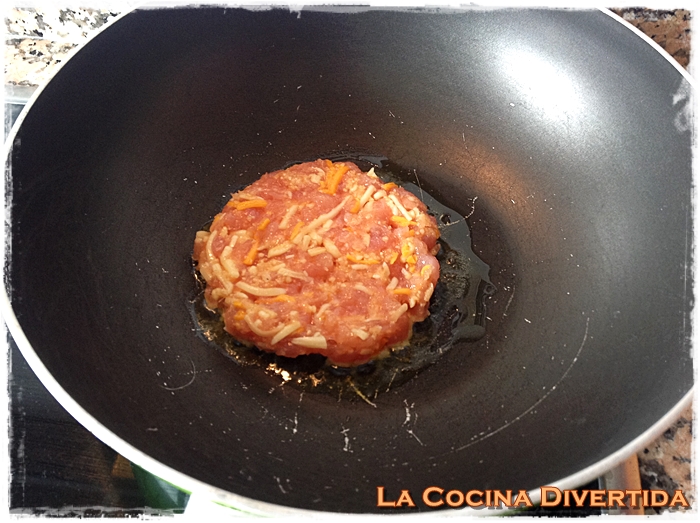- En una sartén con muy poco aceite, unas gotas, hacemos a la plancha las hamburguesas por ambos lados (obviamente sin el film). Al fundirse el queso quedará ligeramente quemado y con un sabor extraordinario.