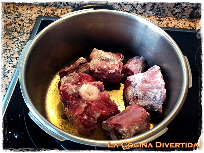 - Salpimentamos los trozos de rabo y enharinamos ligeramente. En una cazuela con un chorrito de aceite de oliva vamos a saltear los trozos de rabo, para que se doren y se sellen. Retiramos y reservamos.