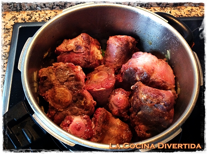 - Vertemos el coñac, dejamos que evapore el alcohol un par de minutos y añadimos el agua o caldo de carne hasta que cubra los trozos de rabo.