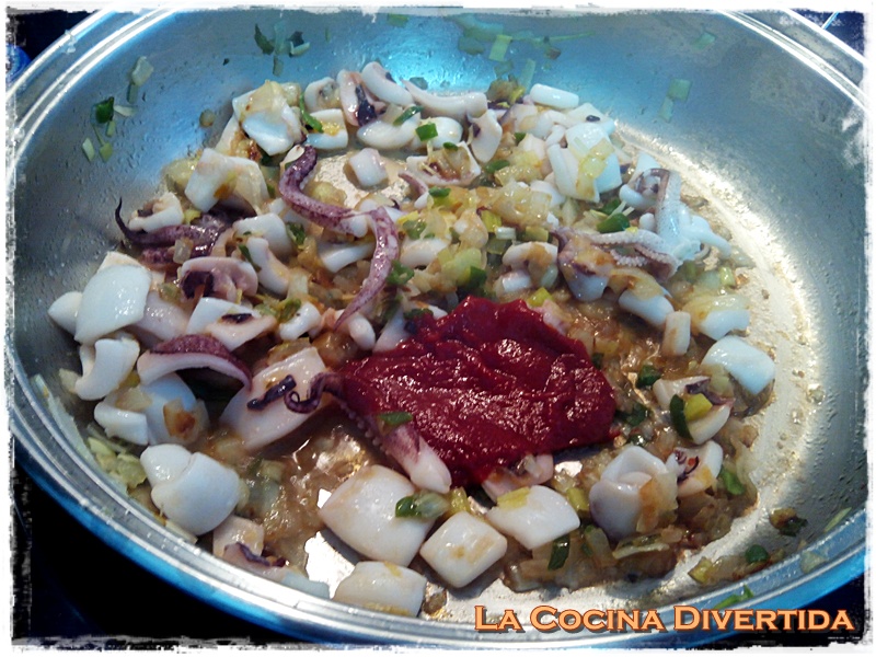 - Limpiamos los chipirones, troceamos y añadimos al sofrito, unos 3 minutos a fuego medio-alto y pasado este tiempo el concentrado de tomate y el vino blanco.