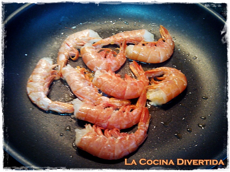 - En una sartén o una plancha con un chorrito de aceite de oliva vamos a saltear los gambones, con un poco de sal, incorporándolos al arroz en los últimos 3 ó 4 minutos.