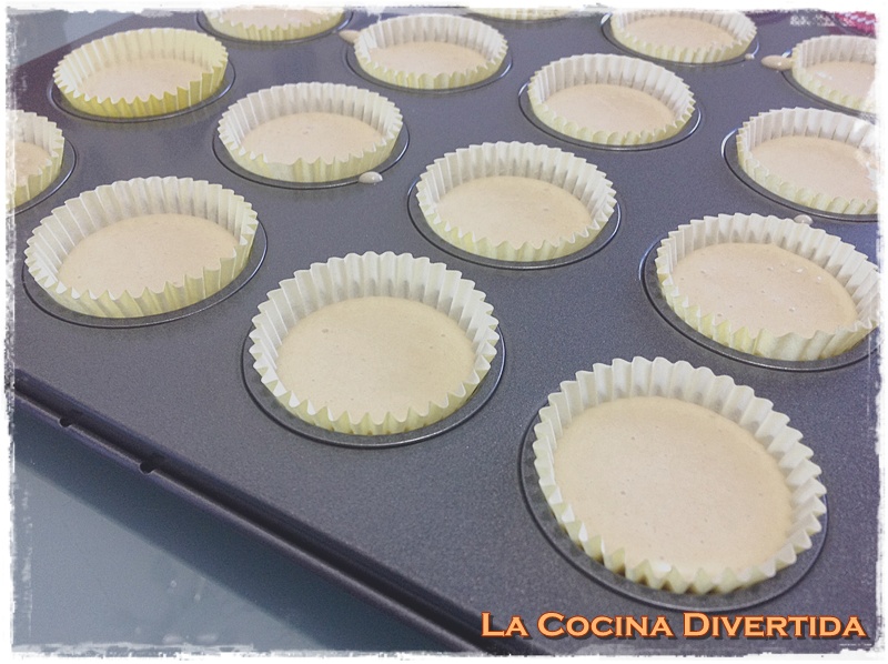 6. En moldes para mini magdalenas echamos la masa, si te ayudas de una manga pastelera (o una bolsa limpia a la que cortes una esquina) será más fácil. Vamos a rellenar los moldes a dos tercios para que no se salga la masa cuando suban.