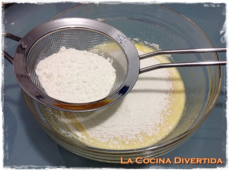 3. Juntamos la harina con la levadura y lo añadimos tamizándolo, con un tamiz o un colador para que esté más fino. Añadiremos 150 grs y mezclamos el conjunto.