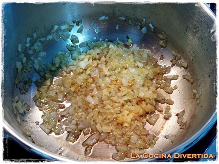 1. En una olla o cazuela vamos a pochar la cebolla bien picadita, en brunoise, con unas tres cucharadas de aceite de oliva. Dejamos a fuego medio-alto con un poco de sal hasta que empiece a dorarse. Mientras, cortamos las costillas (separamos de una en una del costillar).