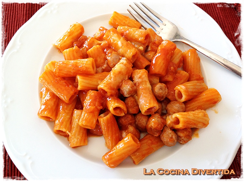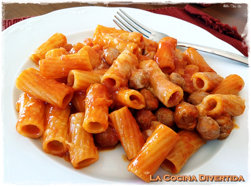 Estos macarrones son tremendamente sencillos y no tienen ninguna complicación. Buena materia prima, la clave. Las salchichas las compro en una carnicería de confianza y la salsa de tomate es casera. Es un acierto el tomate frito casero, lo haces un día y tienes unos cuantos tarros para estas ocasiones. Aquí tienes la receta de tomate frito, los macarrones elige los que más te gusten (estos eran grandotes) o si quieres otra pasta, pero estos estaban genial, con la salsa por denro del macarrón… qué delicia!!