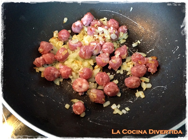 - Cuando empiece a dorarse añadimos las salchichas troceadas y rehogamos el conjunto tres o cuatro minutos más.