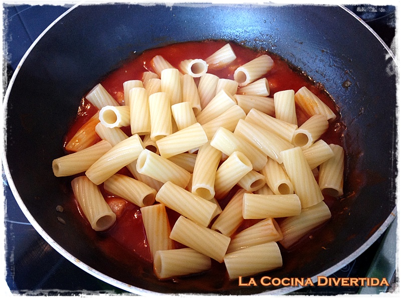 - La pasta se habrá terminado de cocinar por lo que escurrimos bien y añadimos a la salsa de tomate. Removemos bien para que se integre la salsa con la pasta.